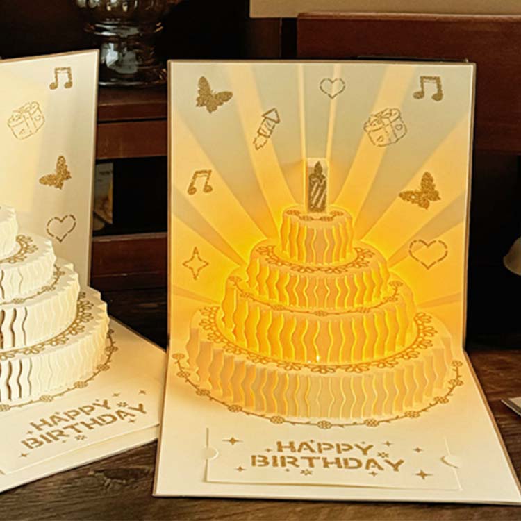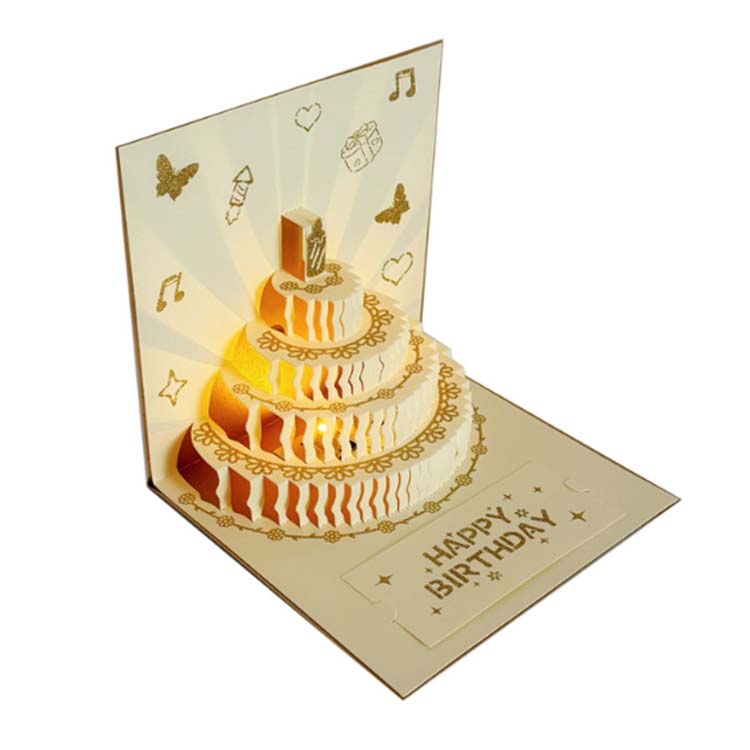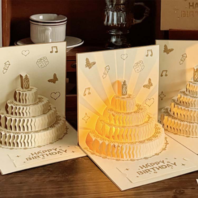 3D туған карточкасы - бұл сәлемдесу картасындағы жаңа өнім. Экологиялық таза және қауіпсіз материалдардан жасалған, ол үш өлшемді пішінді және ішкі жарықтандыру мен музыкалық әсерлермен ерекшеленеді. Шағын және портативті, ол конверттен, картадан және шағын картадан тұрады. Бұл классикалық және заманауи элементтерді аралайтын толық туған күн.