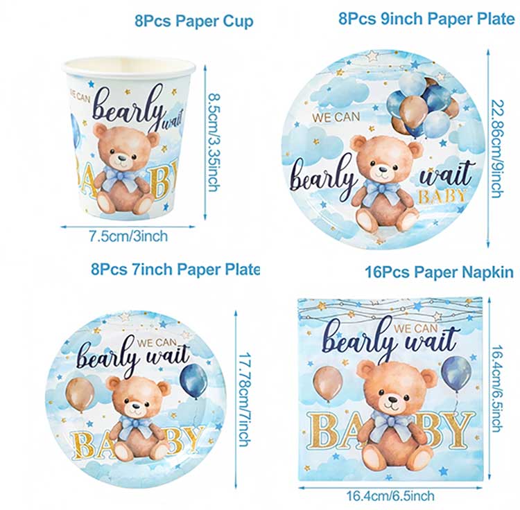 Нәрестенің туған күніне арналған бір рет қолданылатын табақ жиынтығының өлшемі: Өнім OPP пакеттеріне оралған, бірақ қағаз картасының қаптамасы да қол жетімді. Біз қаптаманы тұтынушының нақты талаптарына сәйкес реттей аламыз.