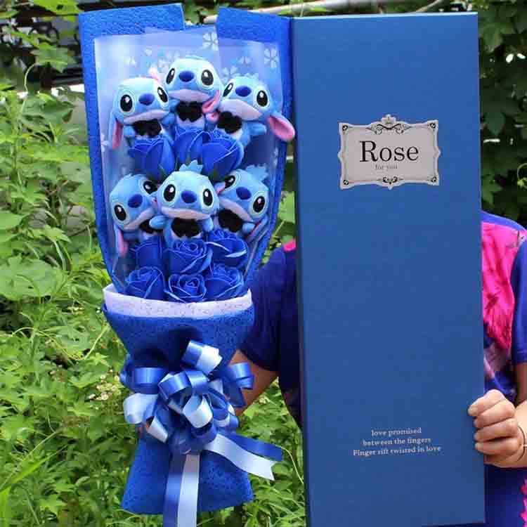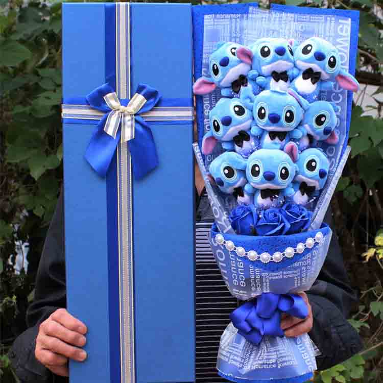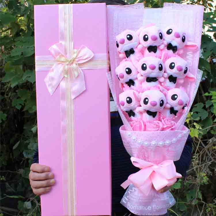 Newshine®-дан осы сүйкімді мультфильмнің букеті қызғылт немесе көк түстің кейіпкерлері, сәйкес келетін қағаз және сыртқы қорапшасы бар миниатюралық белгілермен ерекшеленеді. Бұғатталған еліктірілген гүлдер жалпы түс схемасын толықтырады. Бұл туған күн тосын сыйлары, мерекелік сәлемдер және фото жолдар үшін өте жақсы.