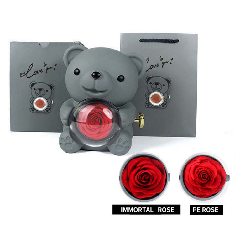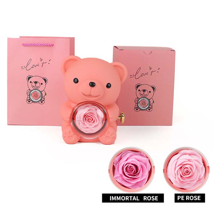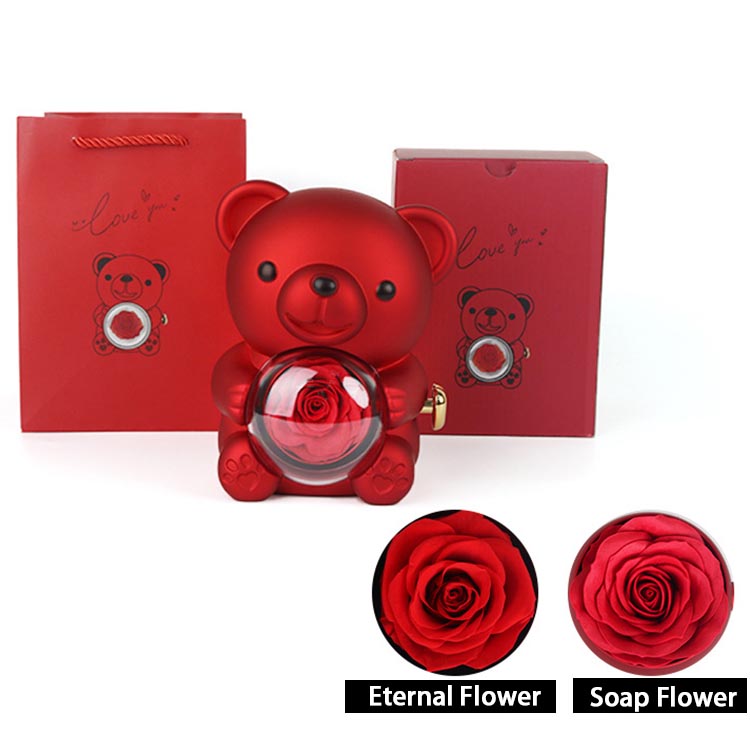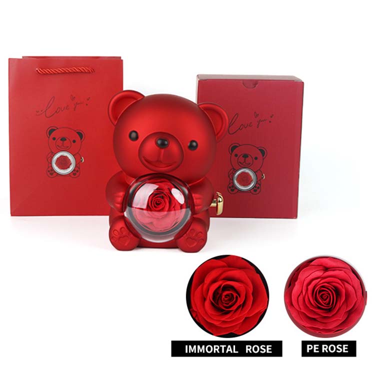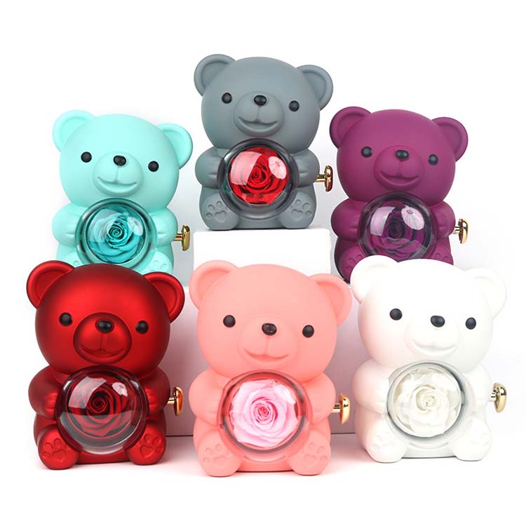 Құшақ аюы консервіленген гүлдер Зергерлік бұйымдар қорабында әдемі әсер, зергерлік бұйымдардың интимдік қорғалуы,Олар жаңа аю пішінінің дизайнымен бірге әдемі естеліктерге толы болады.