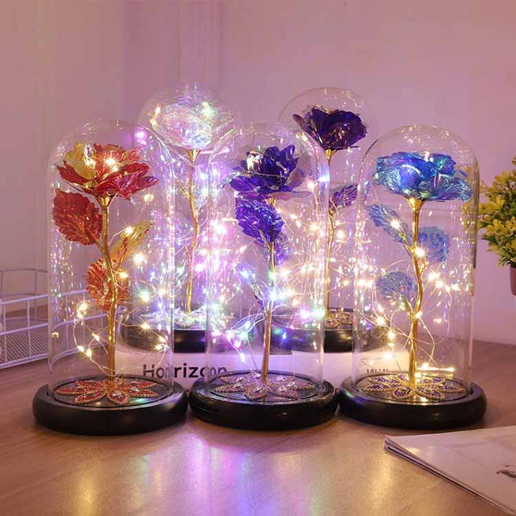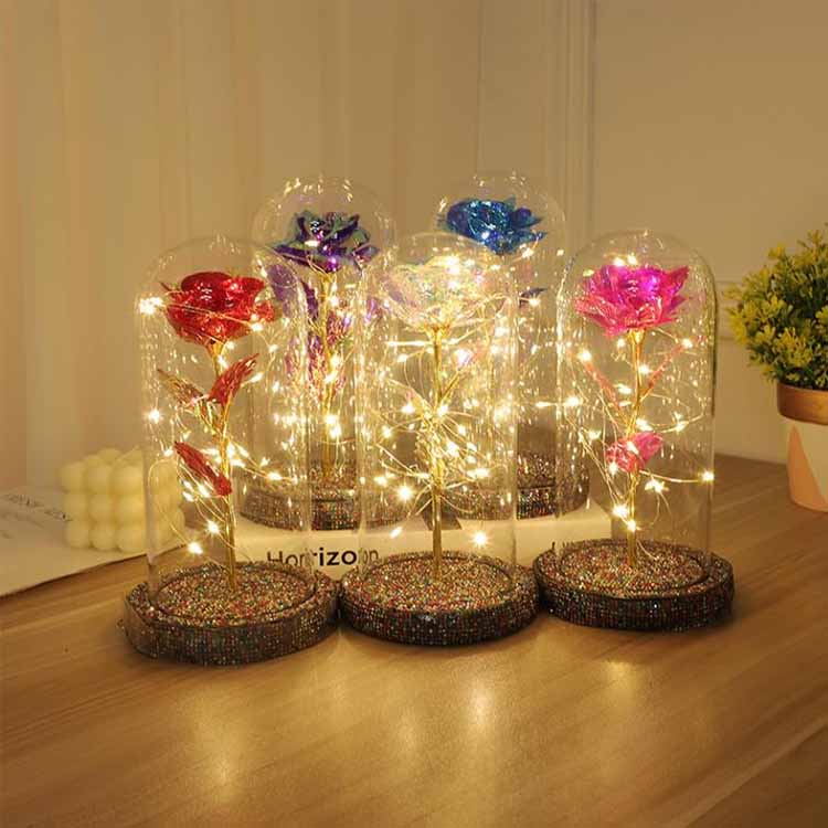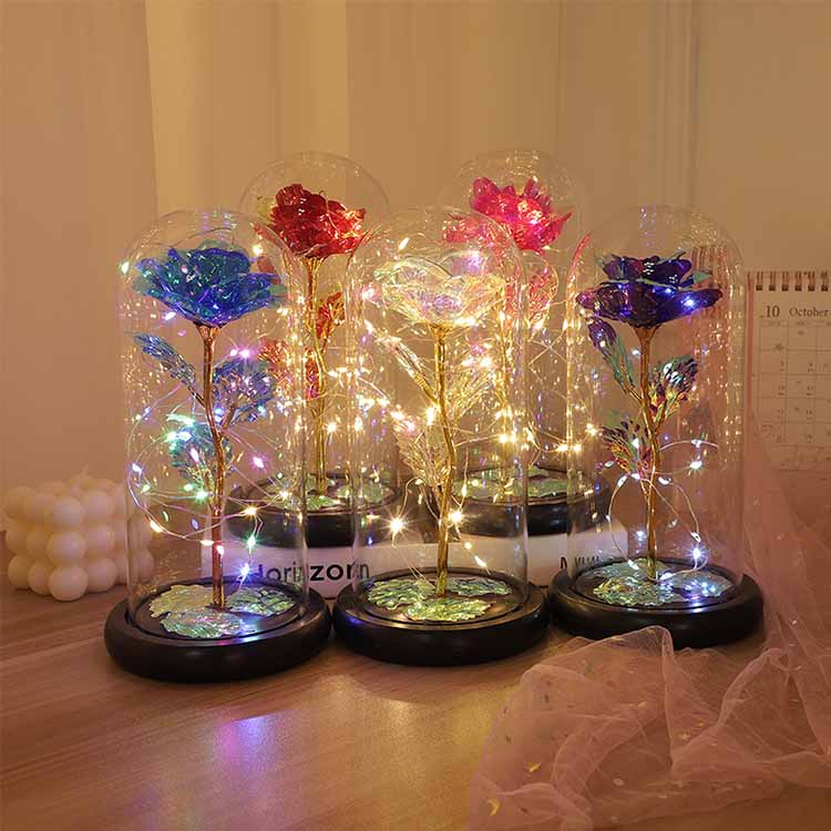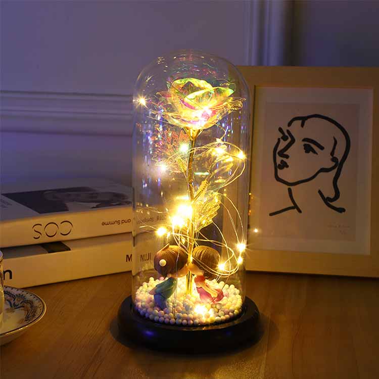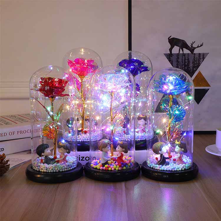 Жарық диоды 24к әйнек қорғаныш корпусының ішіне көтеріліп, бізде көптеген қуыршақтар мен ойыншықтар бар. Клиенттер өздерінің сүйікті қуыршақтарын және оларға ұнайтын гүлдердің түсін таңдай алады. Біз оларды сіздің талаптарыңызға сай баптай аламыз.